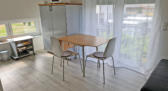 Gästewohnung ohne Balkon Schlafraum mit: o geräumigen Schrank o ein großes Bett o Schreibtisch mit Internet Bad mit: o bodentiefer Dusche, WC und Bidet o Waschbecken, Fön, Außenfenster o Waschmaschine Großer Wohnraum mit: o Einbauküche (u. A. mit Spülmaschine, Herd u. Backofen, Besteck u. Geschirr, Bügelbrett, Staubsauger) o Essecke, Fernseher, Internet, Bettsofa o Bekleidungsschränke
